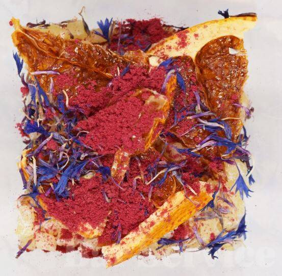 грейпфрут, лепестки синего василька, цедра апельсина, малина, цукаты ананаса, стевия.